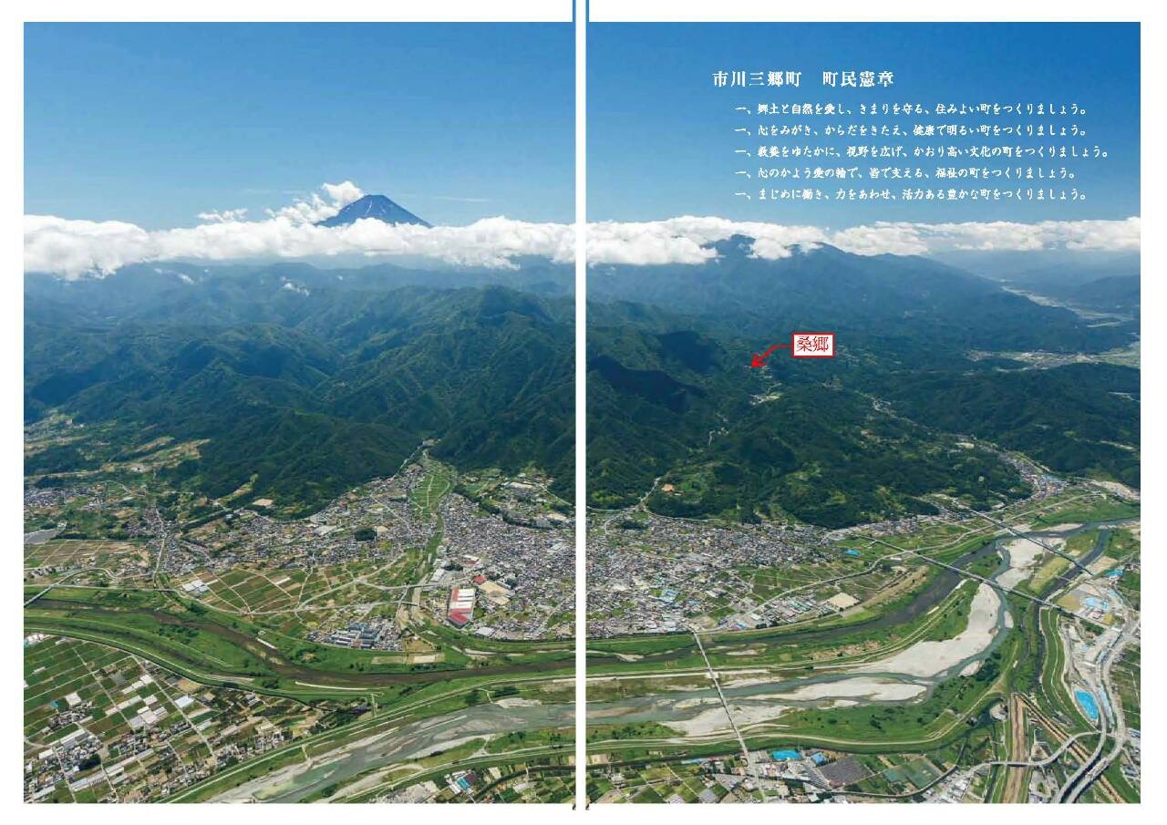 ちなみに、この記念誌の最終ページに市川三郷町の全体写真が載っているのですが、桑郷の場所はここです!山の中!