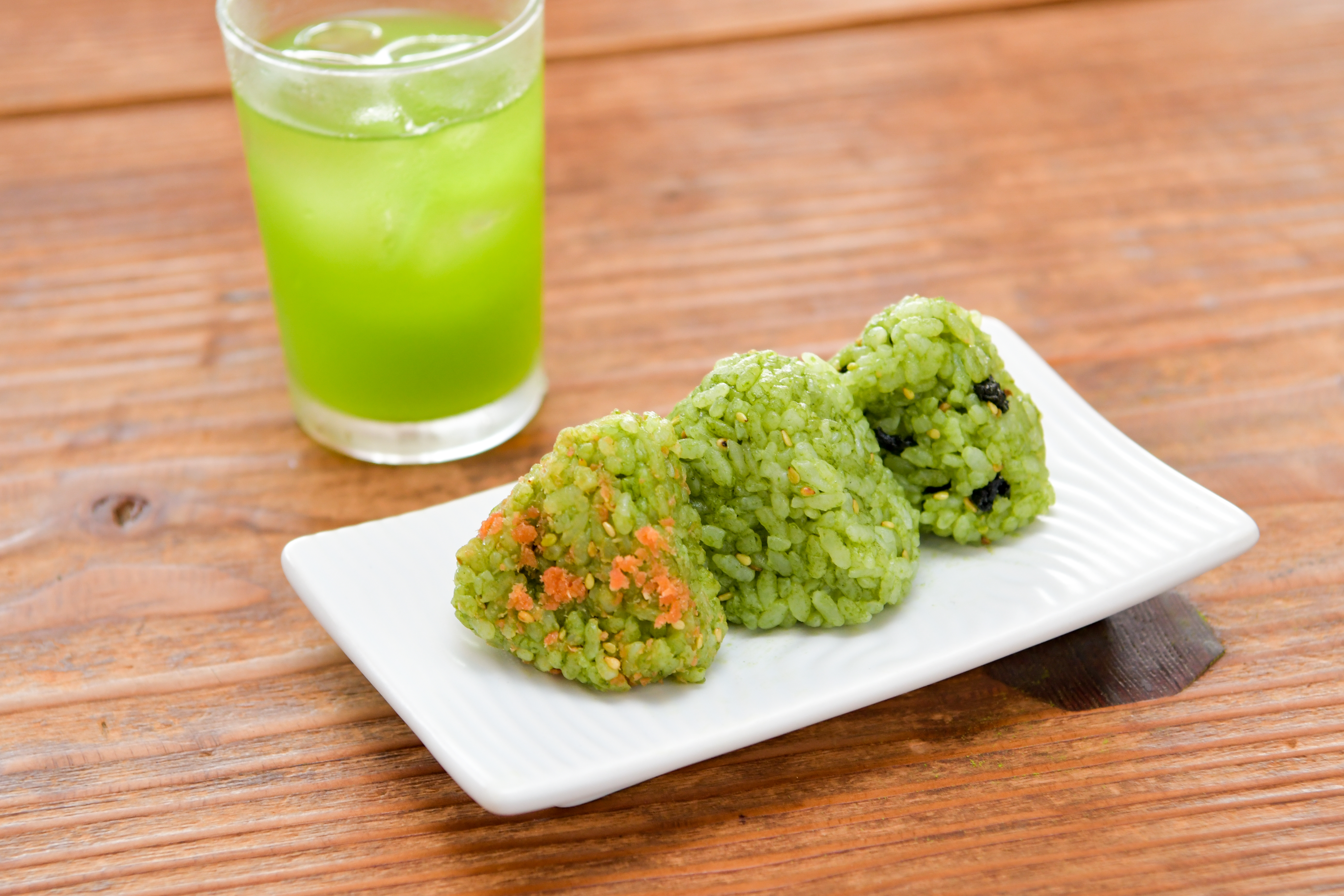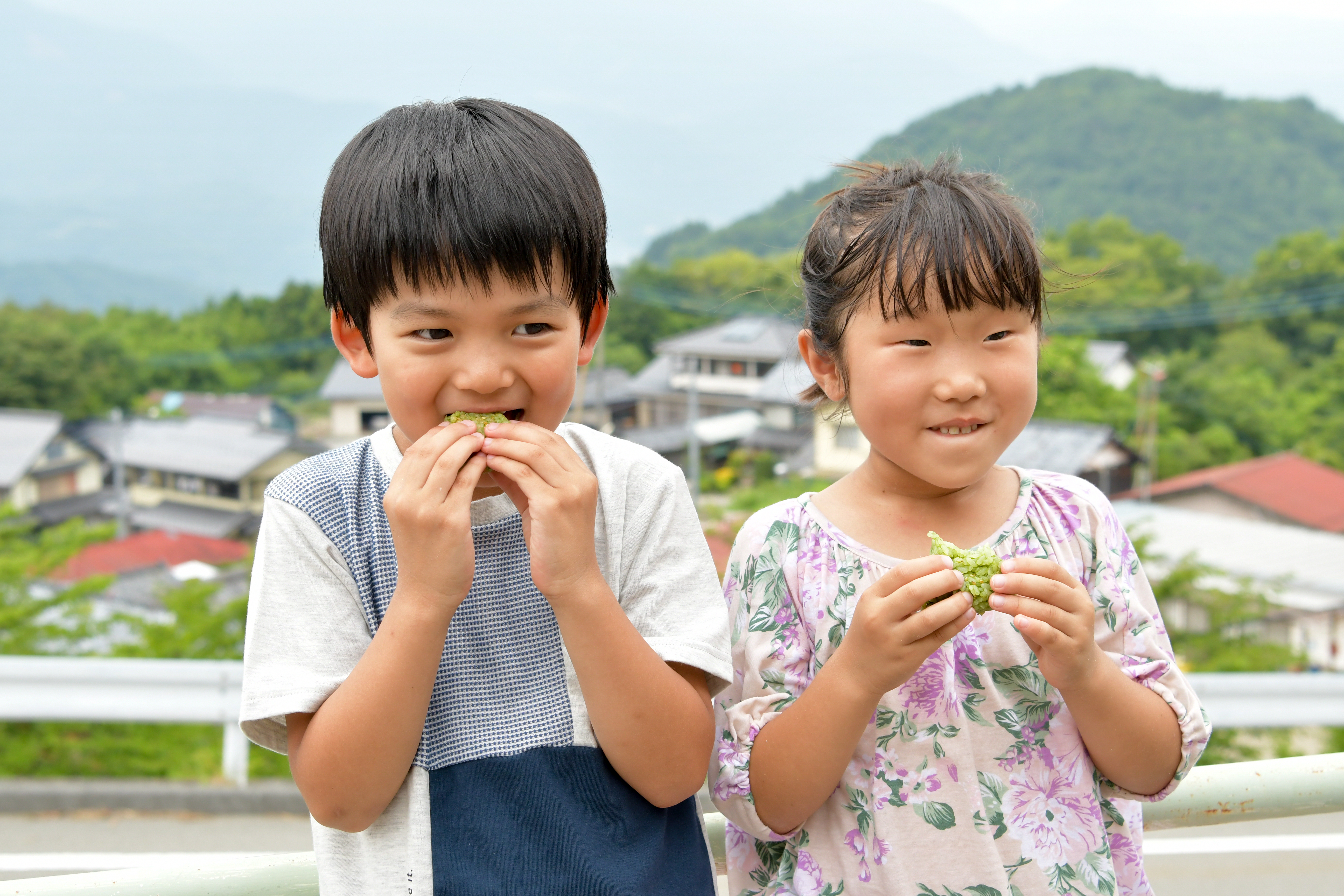 お腹がすいたら、桑の葉パウダーをまぶした桑おにぎりで、腹ごしらえ。 子供たちは正直。美味しいものは美味しいっ!!!