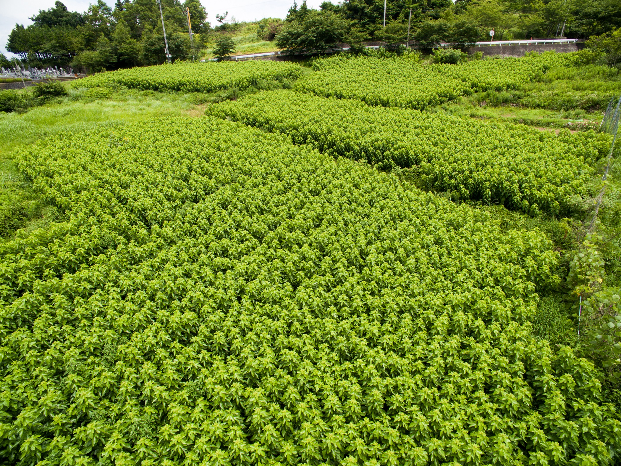 航空写真で見て頂けるように、村の景色が変わりました。桑畑の青々とした生命力が、只今広がっています。