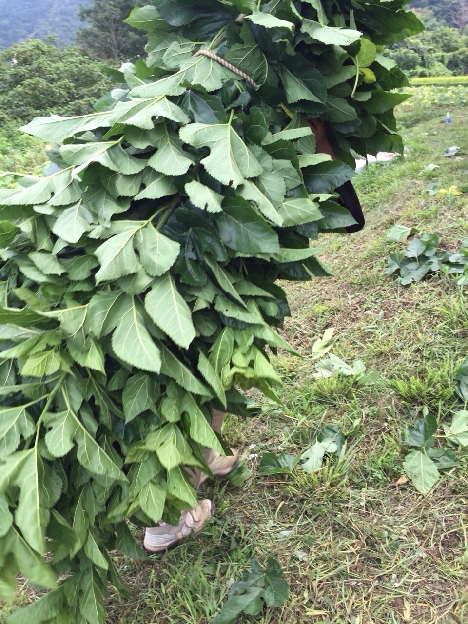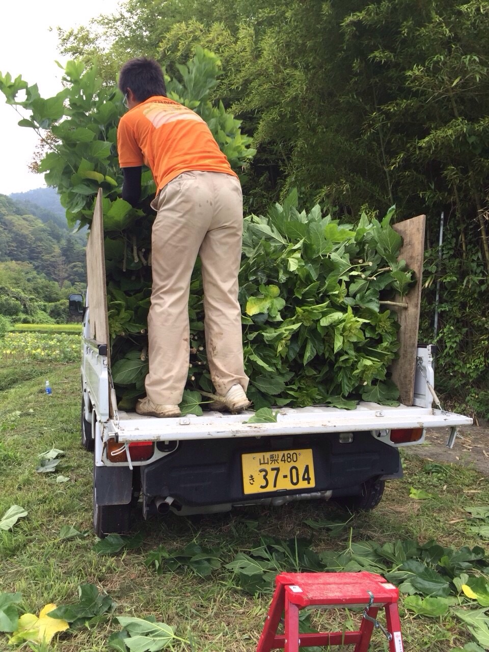 桑を束ねたものを担いで軽トラックに積んでいきます。力がいりますね。