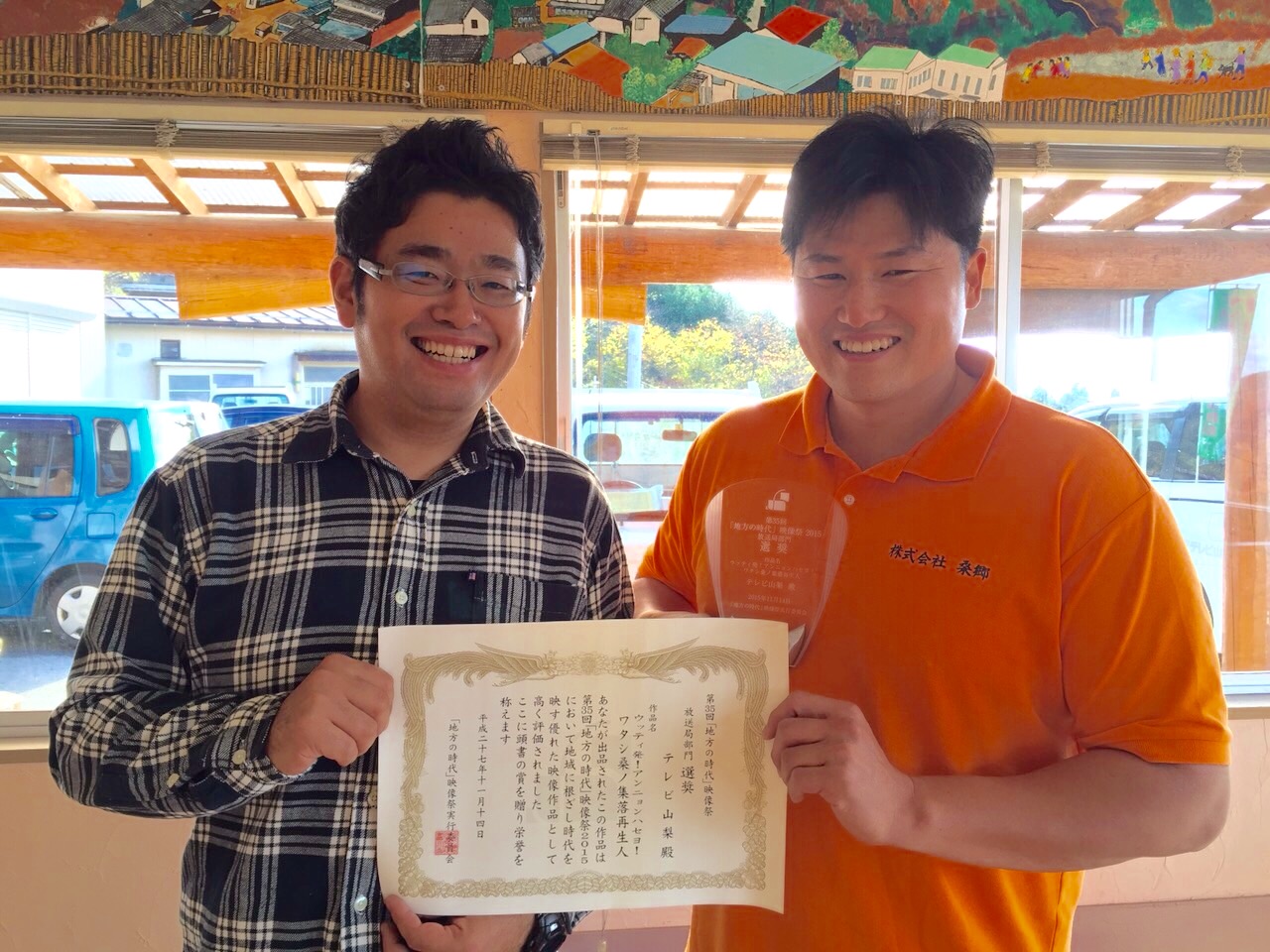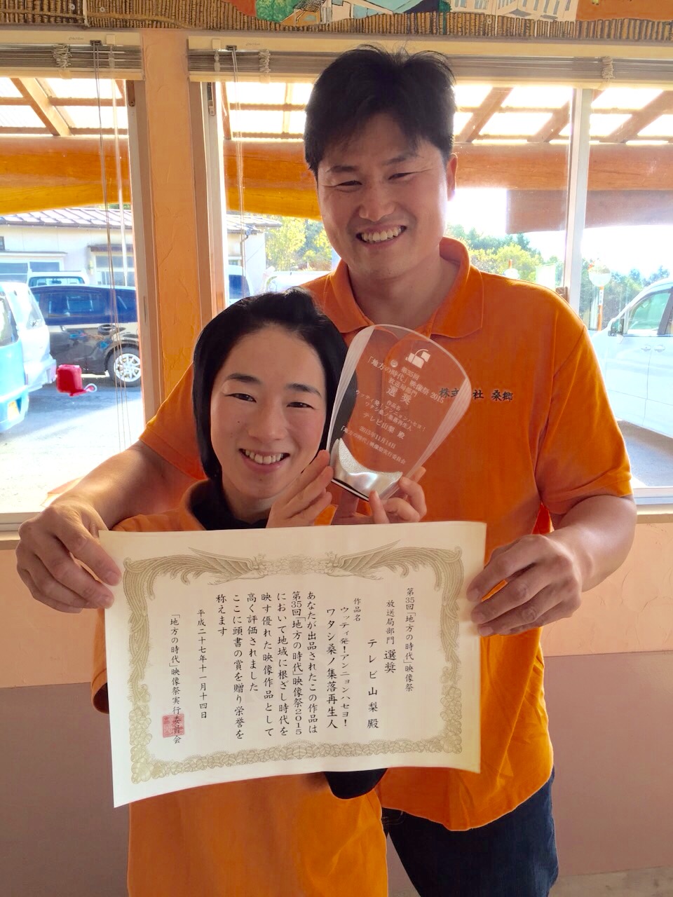 UTYテレビ山梨の岩崎ディレクターが桑郷にトロフィーを持って寄ってくださいました。