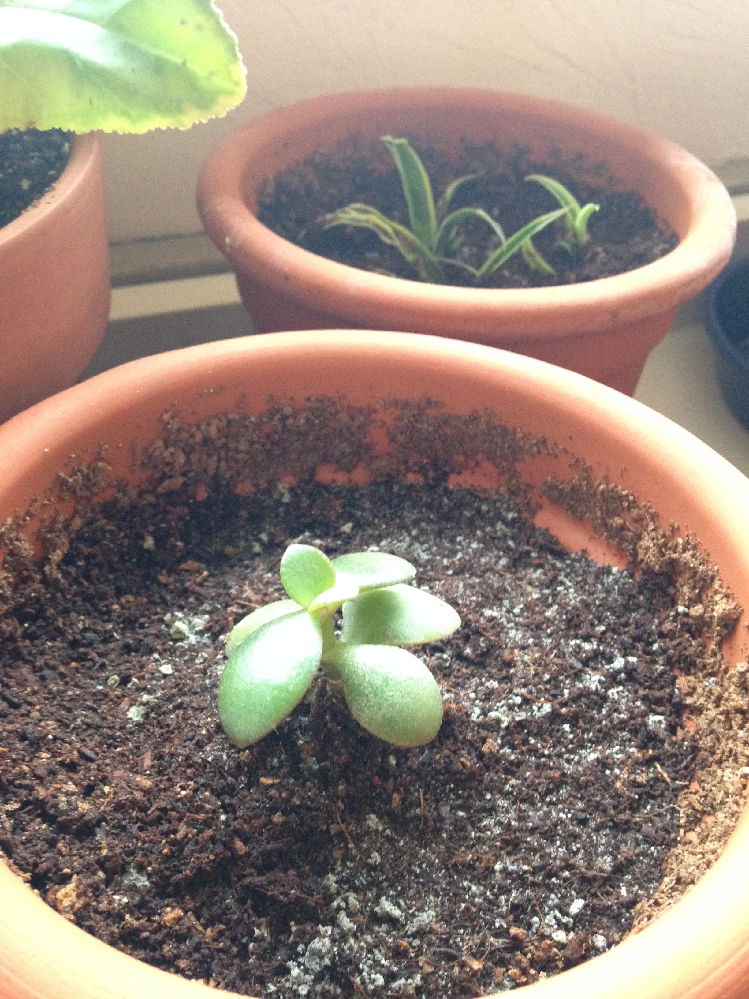 窮屈そうだったので、大きな鉢に植え替えてあげました。『金のなる木』はぽろっと落ちた葉から根っこが出てきて、土に根を張るんです。