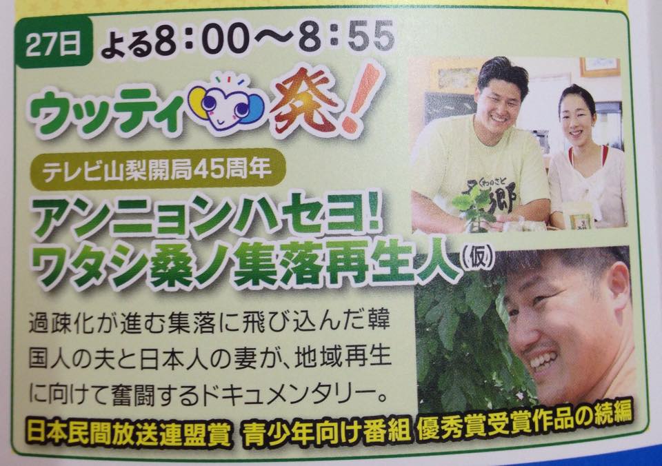 UTYテレビ山梨 『アンニョンハセヨ!ワタシ桑ノ集落再生人』にて1時間ドキュメンタリー番組で紹介されました。2011年に『アンニョンハセヨ!ワタシ桑ノ再生請負人』が放送されて、その続編の番組になります。ご覧になりたい方はDVDを差し上げます。お気軽にご連絡ください。